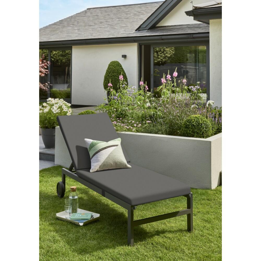 The?Norfolk Leisure Titchwell Sun Lounger & Cushion Has A Simple Frame With?An Adjustable Back That Takes You From Lying Flat For Sunbathing To Sitting Up. It Has Wheels On One End To Allow For Easy Movement In The Garden.?The Aluminium Anthracite Frame Has A Textilene Base & Comes With A Cushion?In Dark Grey.?The Cushions Are A Durable Acrylic/Polyester Mix With A Showerproof Coating.