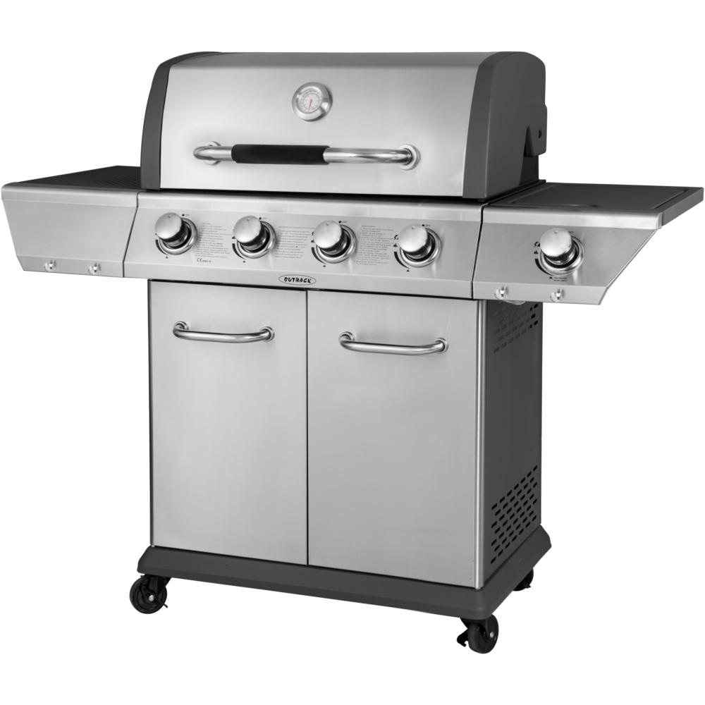 The Outback Tango 4 Burner Gas Bbq Is A Stainless Steel Bbq With Side Burner Featuring A Large Roasting Hood And A Storage Cabinet. Its Stainless Steel Hood Has An Inner Layer For Improved Heat Retention And A Heat Indicator To Monitor The Temperature. Its Stainless Steel Burners Feature Integra-Spark Ignition, Which Automatically Lights The Burner While Turning On The Control Knob. It Has Porcelain Enamelled Cast Iron Cooking Grills And Flame Tamers Along With A Stainless Steel Warming Rack.