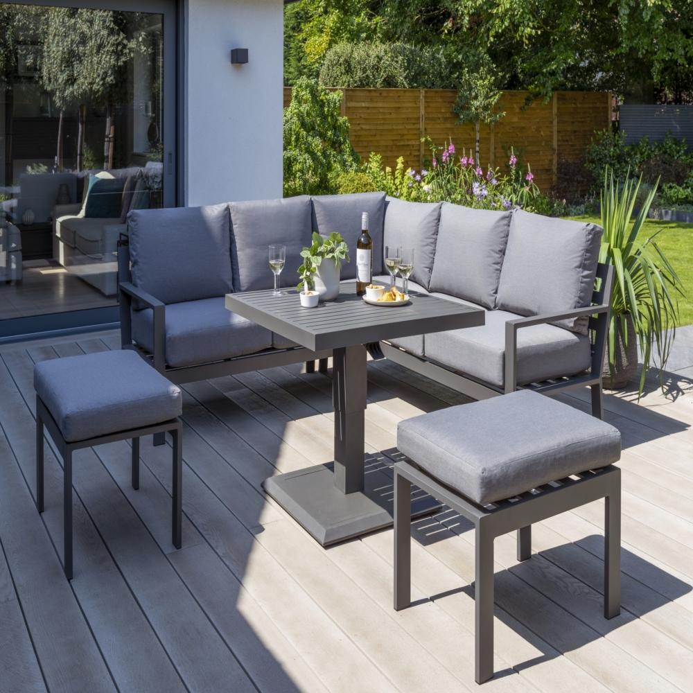The Norfolk Leisure Titchwell Corner Dining Set With Gas Adjustable Table Is Both Contemporary And Practical In Design. Enhanced By Luxurious Showerproof 'All Season' Deep Seating Cushions Which Are A Mix Of Acrylic And Polyester With A Full Inner Waterproof Coating , This Aluminium Corner Dining Set Includes 1 X Left 2 Seat Sofa - H72.5 X W132 X D72Cm, 1 X Right 3 Seat Sofa - H72.5 X W199 X D72Cm, And 2 X Stools - H38.5 X W65 X D45Cm, And A Gas Adjustable Table With Slatted Table Top - H53-76 X W85 X D85Cm. This L Shape Garden Furniture Set Not Only Looks Great, But Is Highly Durable And Low Maintenance.